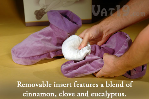 Foot Cozy Heated Slippers provide relief from tired, cold, or sore feet. Simply toss these one-size-fits-all slippers into the microwave and enjoy the comfort of an enveloping warmth combined with an aromatherapy blend of cinnamon, clove, and eucalyptus.